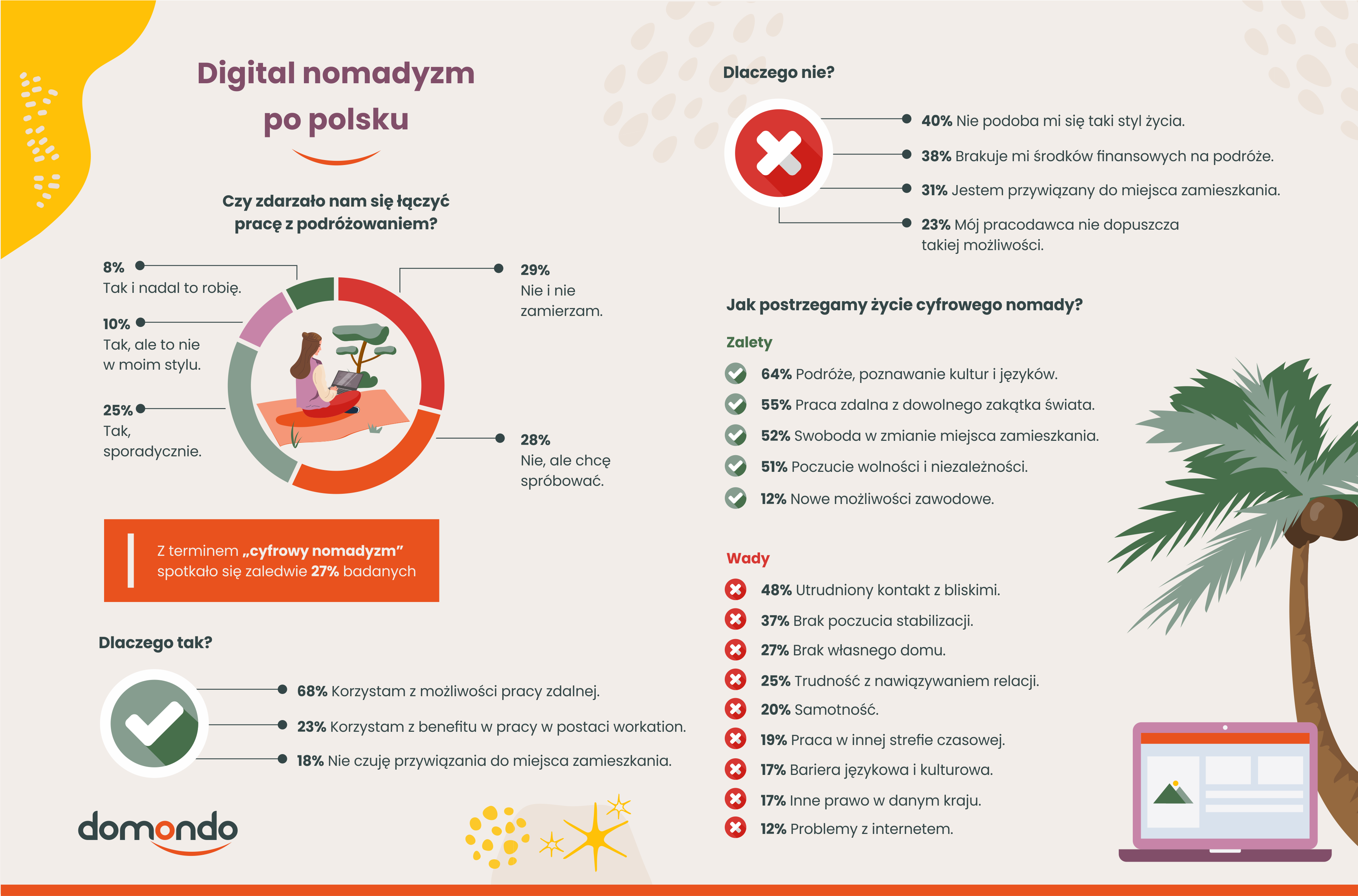 Dla niektórych wyjściem z tej sytuacji może być wyjazd. Coraz więcej młodych ludzi korzysta z możliwości, jakie dają nowoczesne technologie i decyduje się na tzw. cyfrowy nomadyzm. Łączenie pracy z podróżowaniem po świecie obecnie deklaruje 8% badanych, jednak jakiekolwiek doświadczenia z tym związane ma 42% respondentów (głównie to osoby w wieku 25-44 lata). Większości z nich decyzję o wyjeździe umożliwiła praca zdalna, która upowszechniła się od czasu pandemii.