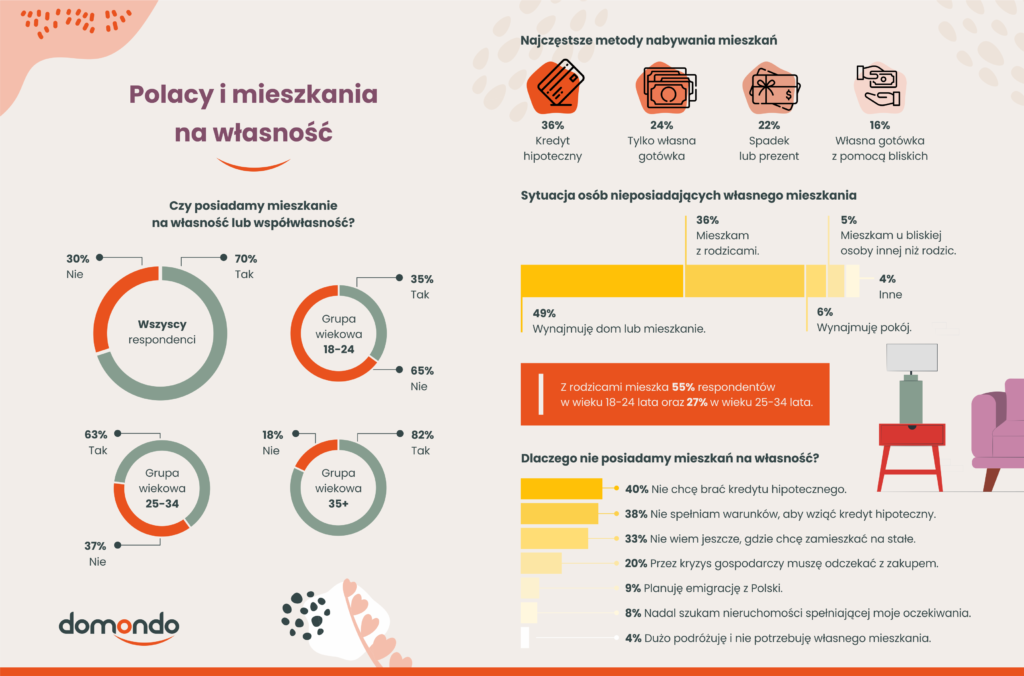 Mieszkanie na własność lub współwłasność posiada 7 na 10 uczestników badania. Spośród nich 40% kupiło je za gotówkę (wyłącznie swoją lub z pomocą finansową bliskich), a 36% musiało wziąć kredyt hipoteczny. Z kolei 22% ankietowanych swoje mieszkanie odziedziczyło lub dostało w prezencie. W trudnej sytuacji są zwłaszcza młodzi dorośli – w grupie wiekowej 25-34 lata odsetek posiadaczy mieszkań wynosi 63%, a w grupie 18-24 lata już tylko 35%.